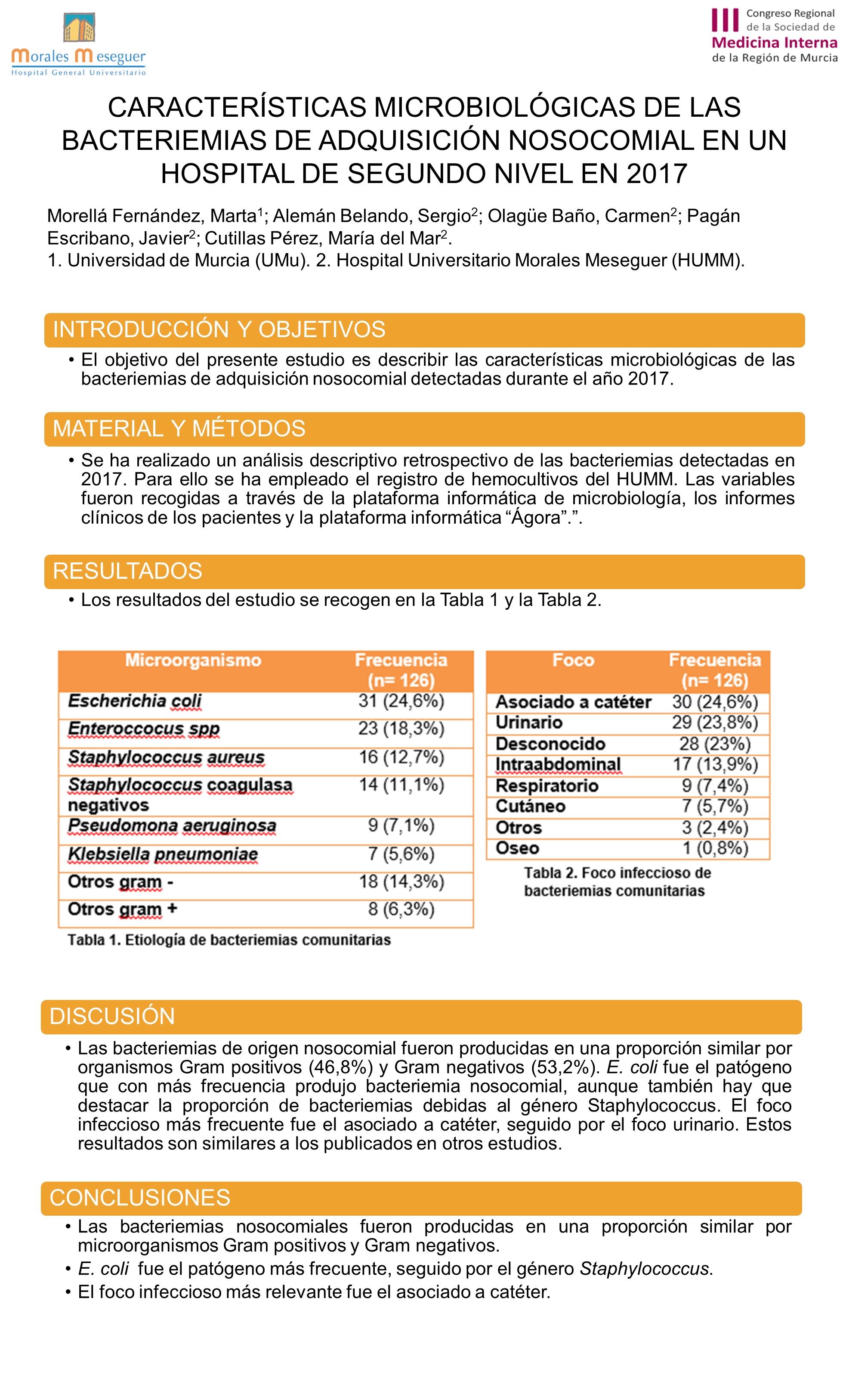 | P66 | Título: Características microbiológicas de las bacteriemias de adquisición nosocomial en un hospital de segundo nivel en 2017. Autores: M. Morellá Fernández; S. Alemán Belando; C. Olagüe Baño; J. Pagán Escribano; M.M. Cutillas Pérez. |