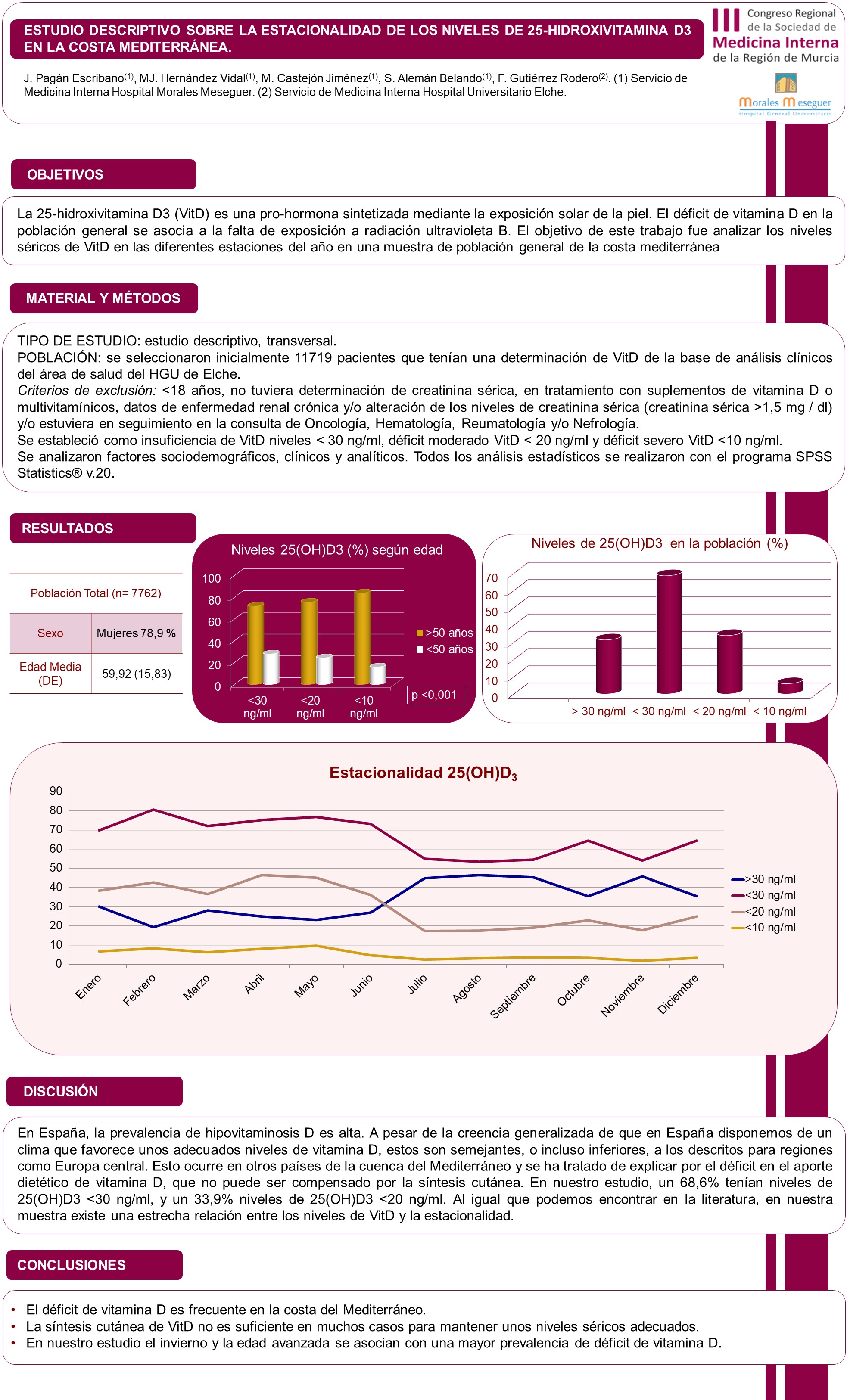 | P70 | Título: Estudio descriptivo sobre la estacionalidad de los niveles de 25-hidroxivitamina D3 en la costa mediterránea. Autores: J. Pagán Escribano; M.J. Hernández Vidal; M. Castejón Giménez; S. Alemán Belando; F. Gutiérrez Rodero. |