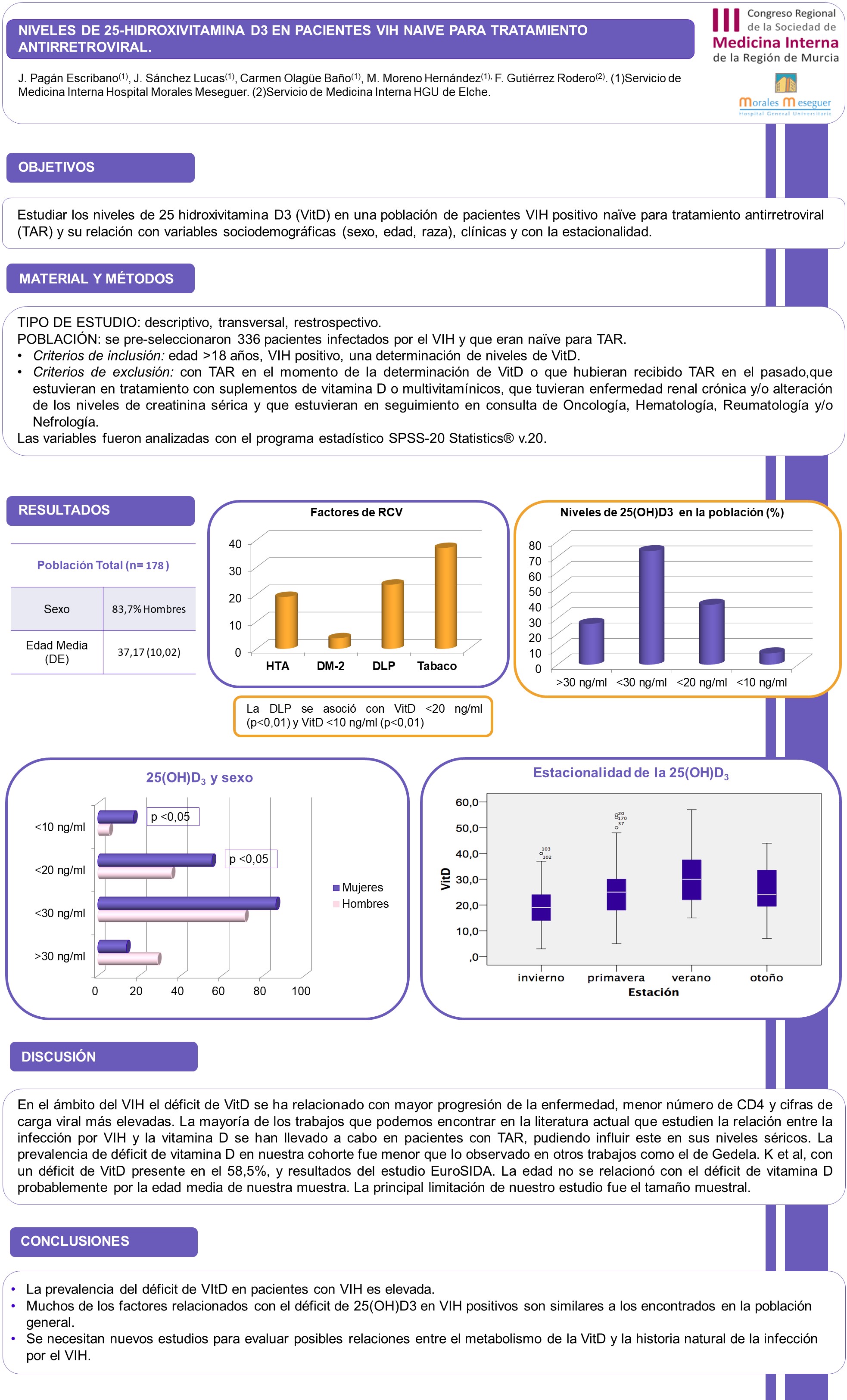 | P71 | Título: Niveles de 25-hidroxivitamina D3 en pacientes VIH naive para tratamiento antirretroviral. Autores: J. Pagán Escribano; J. Sánchez Lucas; C. Olagüe Baño; M. Moreno Hernández; F. Gutiérrez Rodero. |