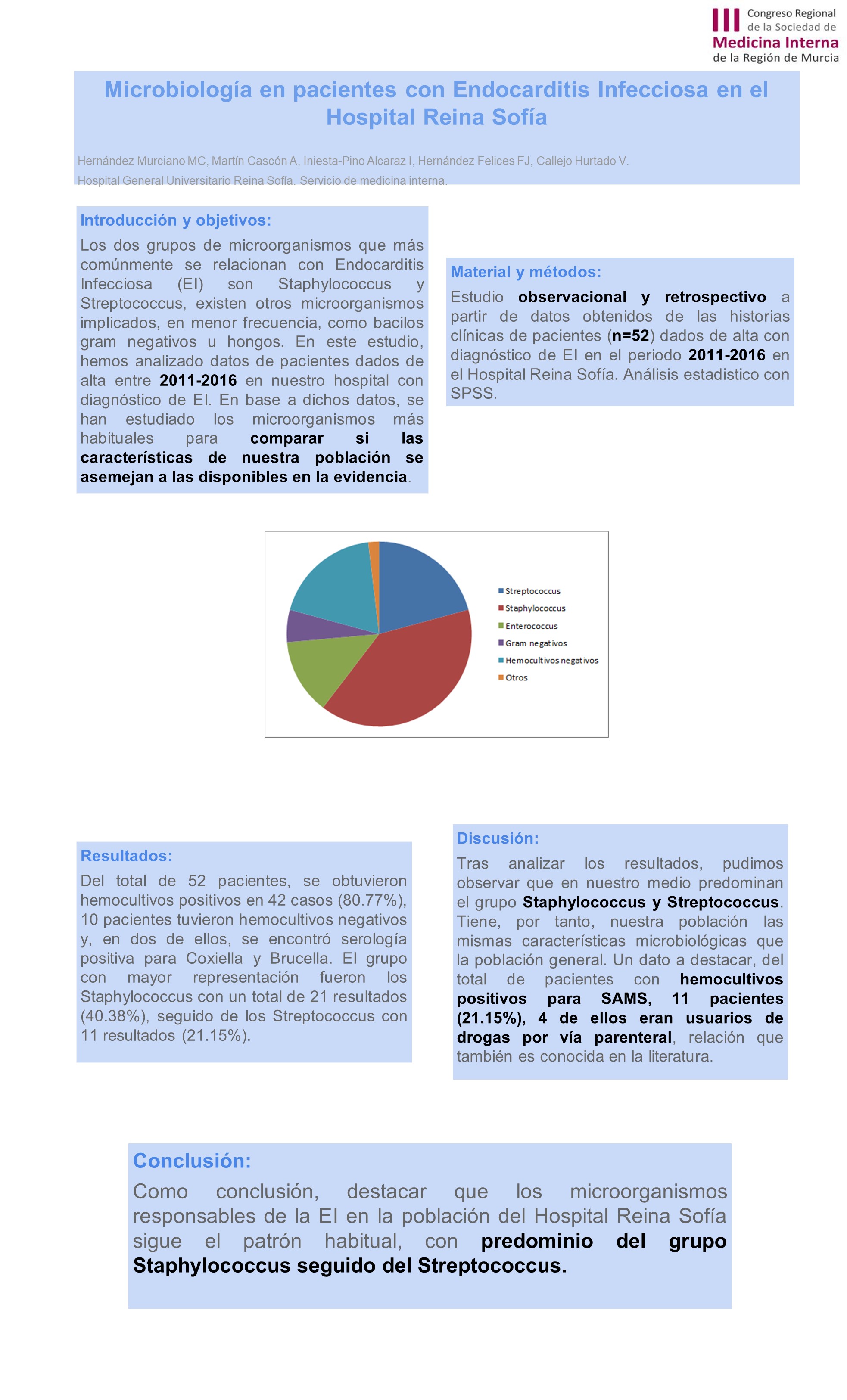 | P72 | Título: Microbiología en pacientes con endocarditis infecciosa en el Hospital Reina Sofía. Autores: M.C. Hernández Murciano; A. Martín Cascón; I. Iniesta-Pino Alcaraz; F.J. Hernández Felices; V. Callejo Hurtado. |