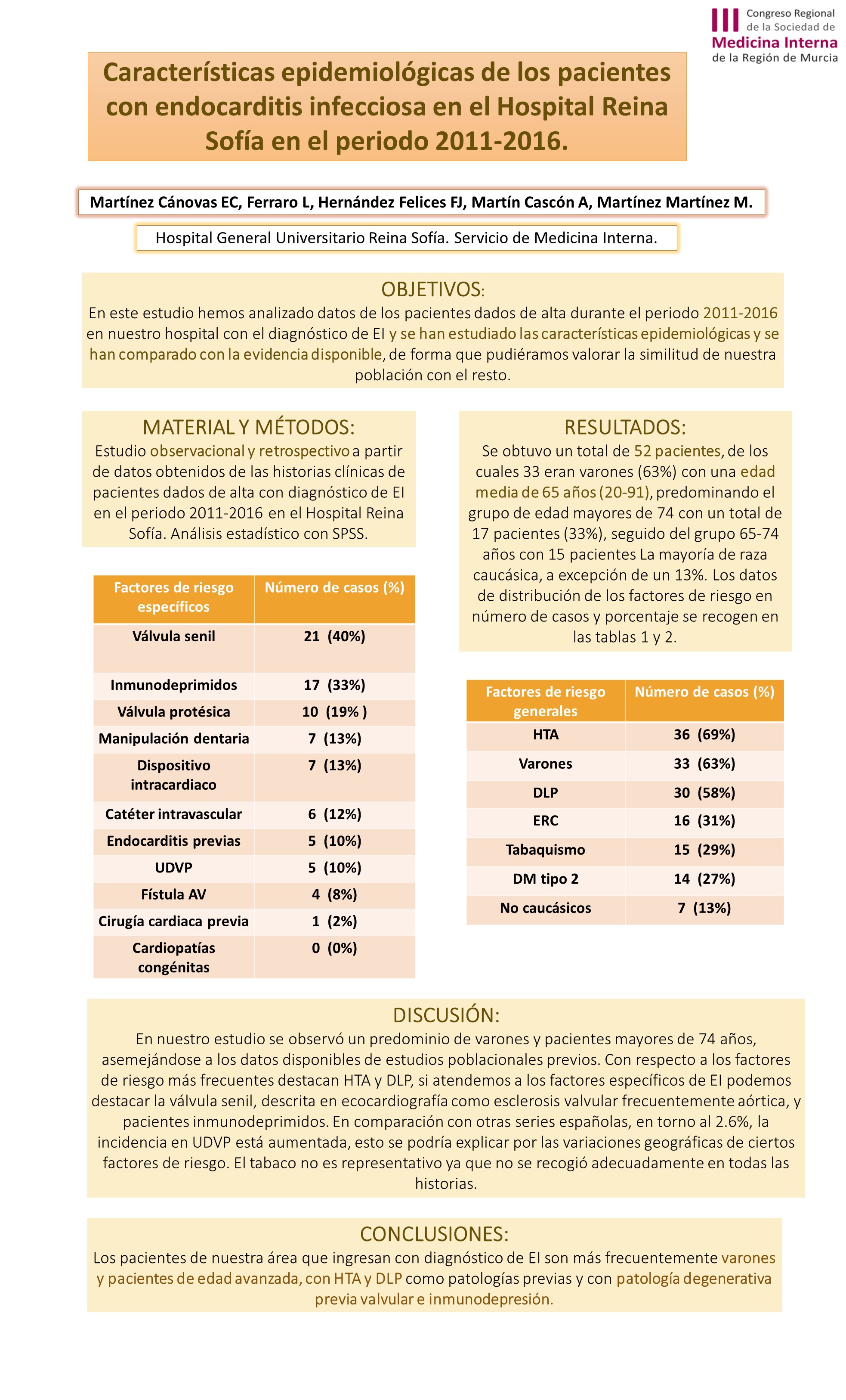 | P73 | Título: Características epidemiológicas de los pacientes con endocarditis infecciosa en el Hospital Reina Sofía en el periodo 2011-2016. Autores: E.C. Martínez Cánovas; L. Ferraro; F.J. Hernández Felices; A. Martín Cascón; M. Martínez Martínez. |