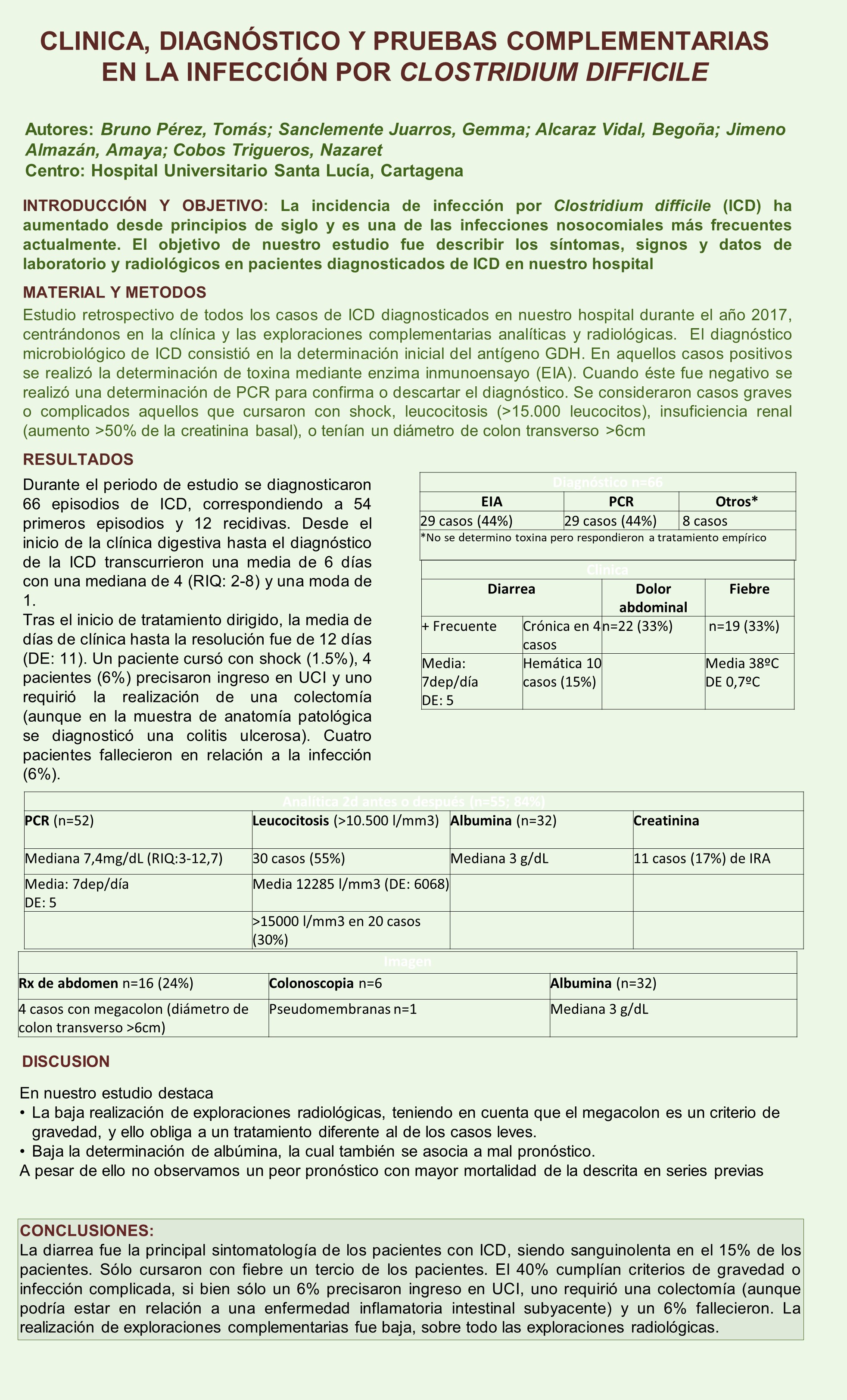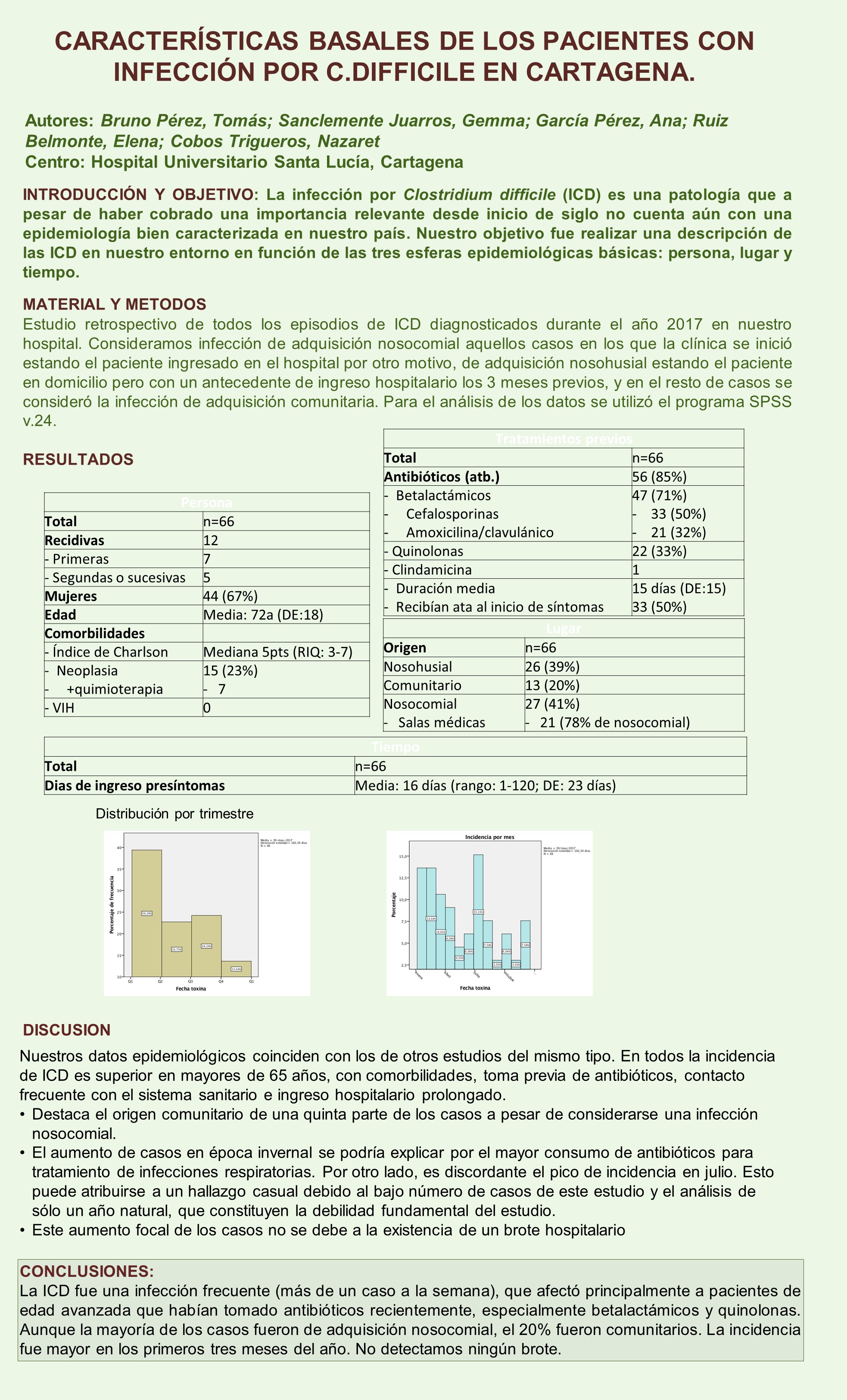 | P76 | Título: Características basales de los pacientes con infección por C. difficile en Cartagena. Autores: T. Bruno Pérez; G. Sanclemente Juarros; A. García Pérez; E. Ruiz Belmonete; N. Cobos Trigueros. |