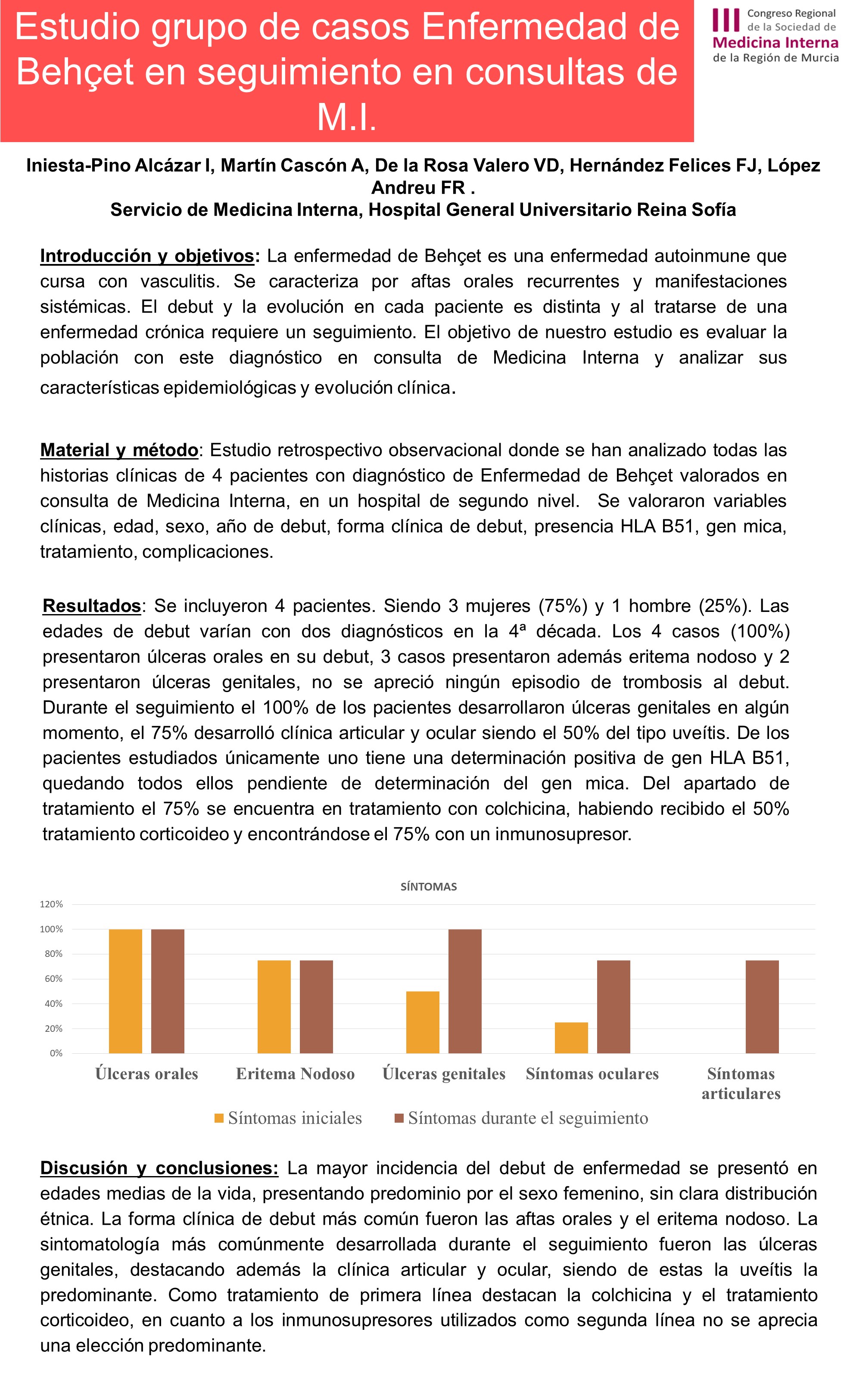 | P78 | Título: Estudio grupo de casos enfermedad de Behçet en seguimiento en consultas de Medicina Interna. Autores: I. Iniesta-Pino Alcázar; A. Martín Cascón; V.D. de la Rosa Valero; F.J. Hernández Felices; F.R. López Andreu. |