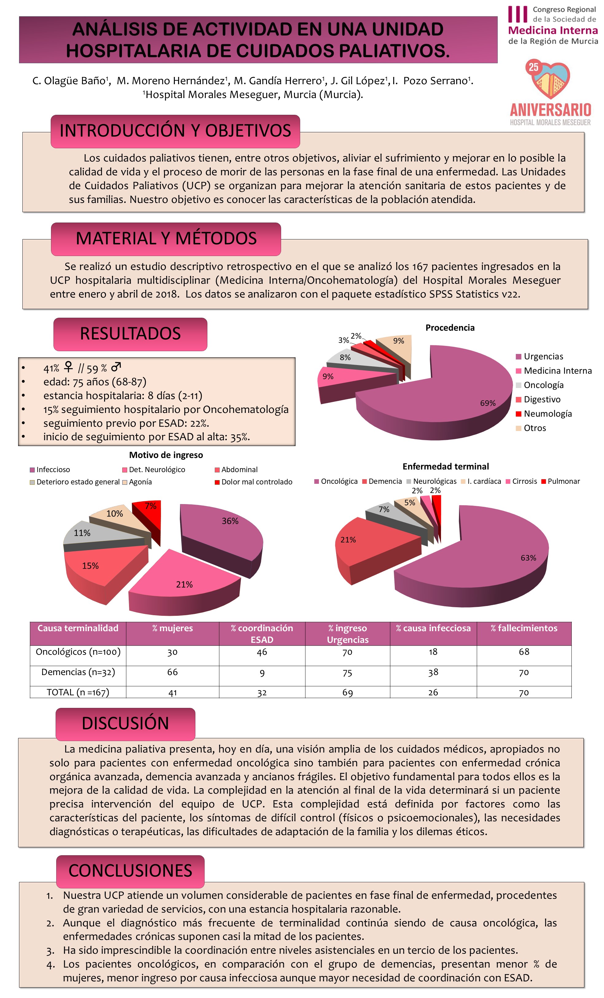 | P79 | Título: Análisis de actividad en una unidad hospitalaria de Cuidados Paliativos. Autores: C. Olagüe Baño; M. Moreno Hernández; M. Gandía Herrero; J. Gil López; I. Pozo Serrano. |