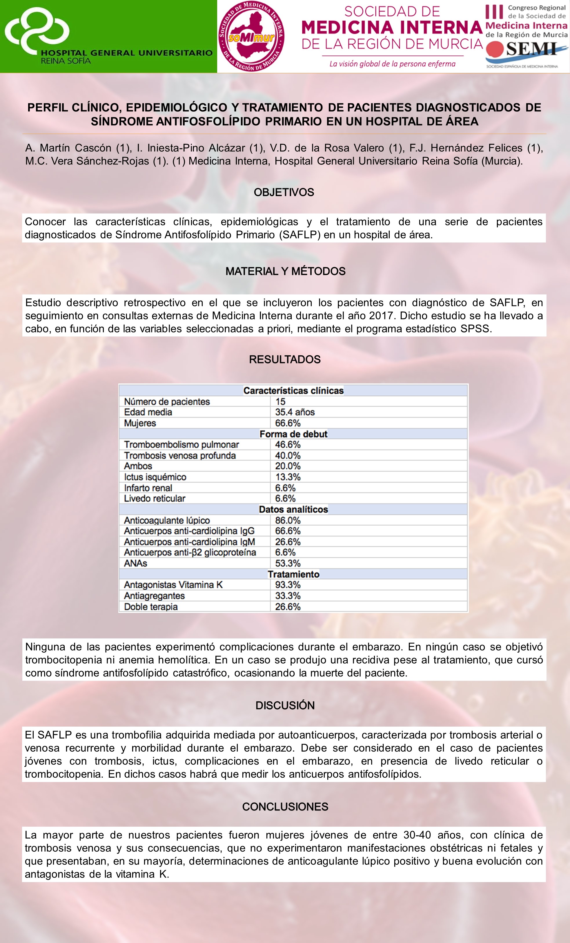 | P80 | Título: Perfil clínico, epidemiológico y tratamiento de pacientes diagnosticados de síndrome antifosfolípido primario en un hospital de área. Autores: A. Martín Cascón; IO. Iniesta-Pino Alcázar; V.D. de la Rosa Valero; F.J. Hernández Felices; M.C. Vera Sánchez-Rojas. |