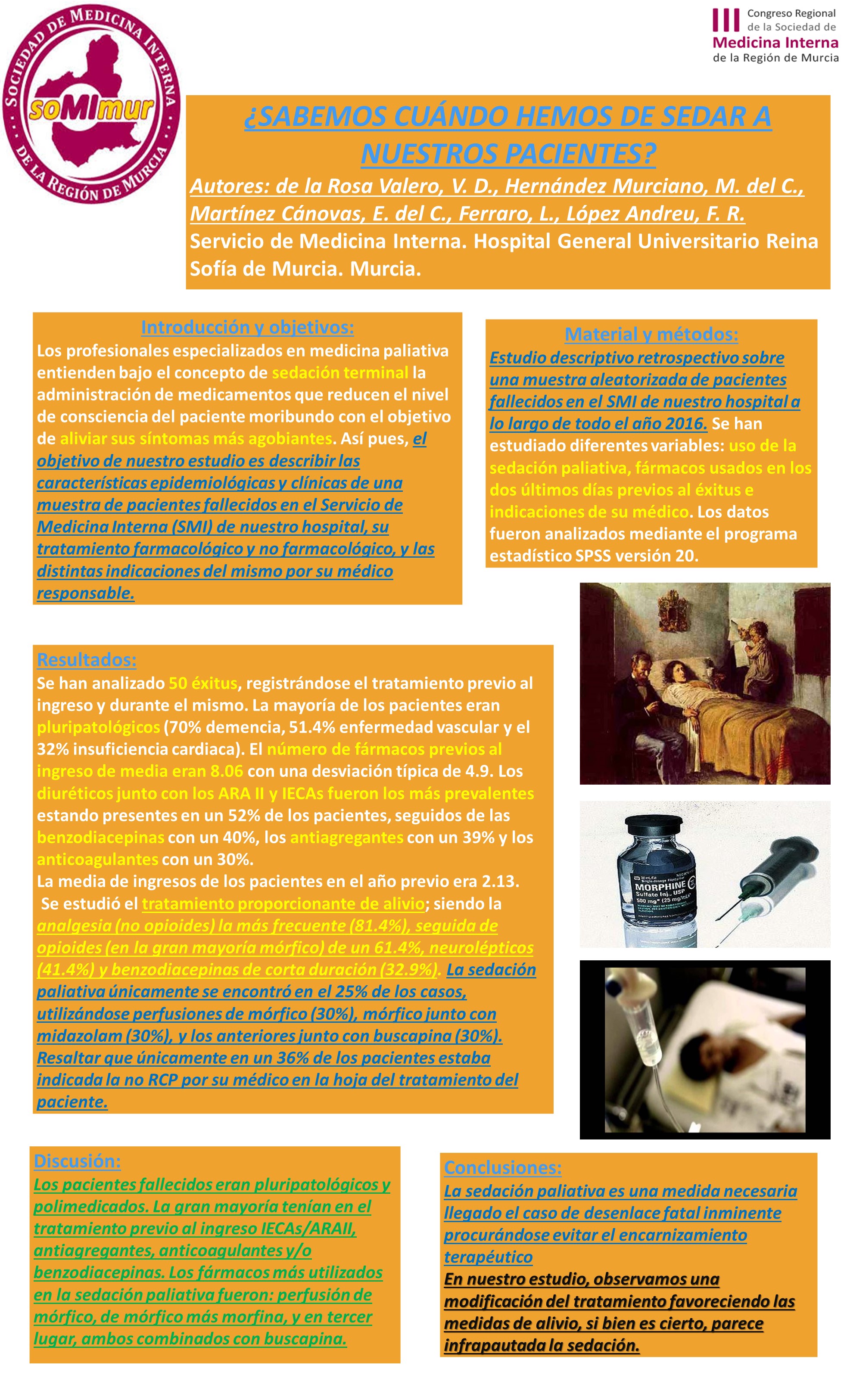 | P81 | Título: ¿Sabemos cuándo hemos de sedar a nuestros pacientes? Autores: V.D. de la Rosa Valero; M.C. Hernández Murciano; E.C. Martínez Cánovas; L. Ferraro; F.R. López Andreu. |