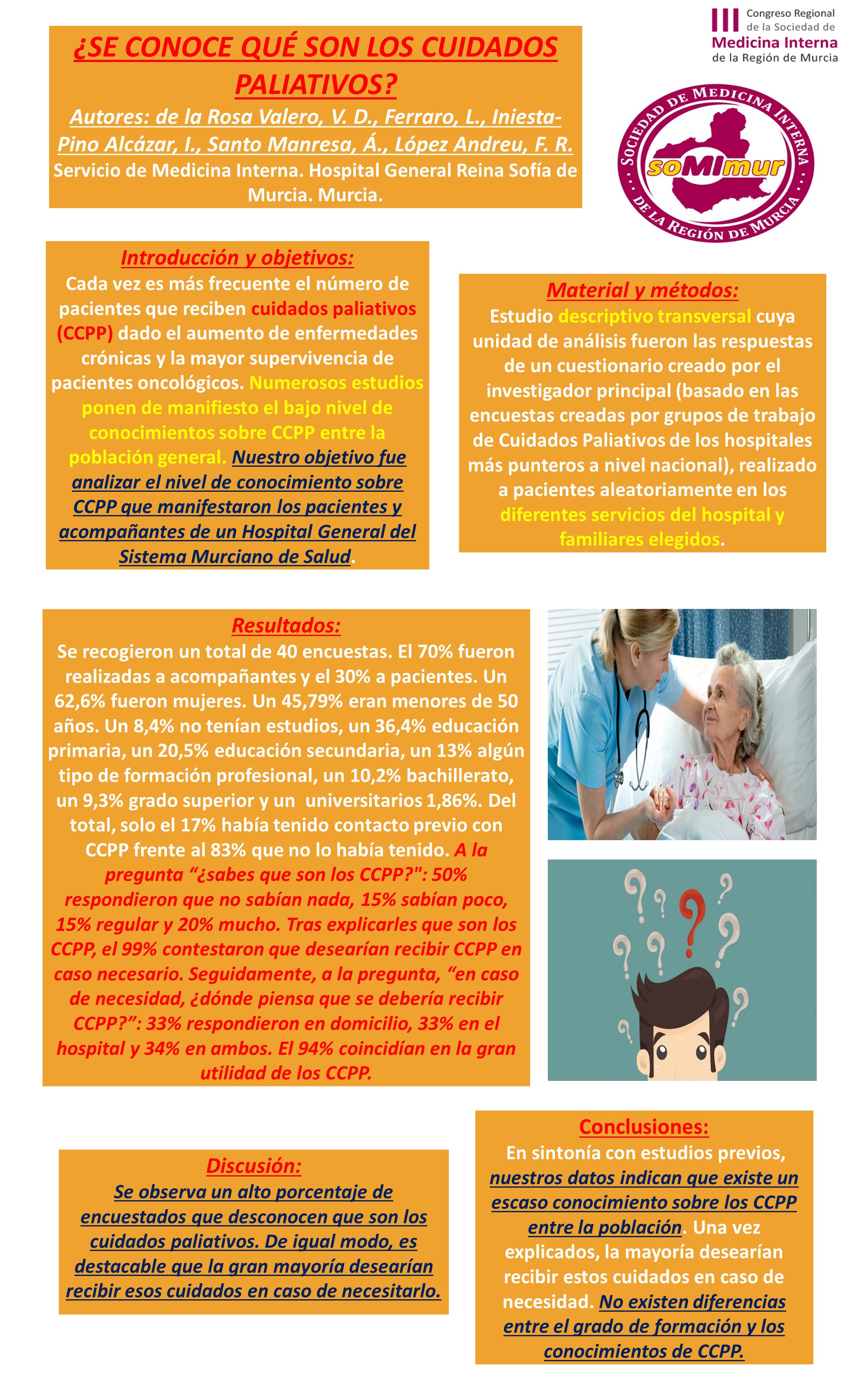 | P82 | Título: ¿Se conoce qué son los cuidados paliativos? Autores: V.D. de la Rosa Valero; L. Ferraro; I. Iniesta-Pino Alcázar; A. Santo Manresa; F.R. López Andreu. |