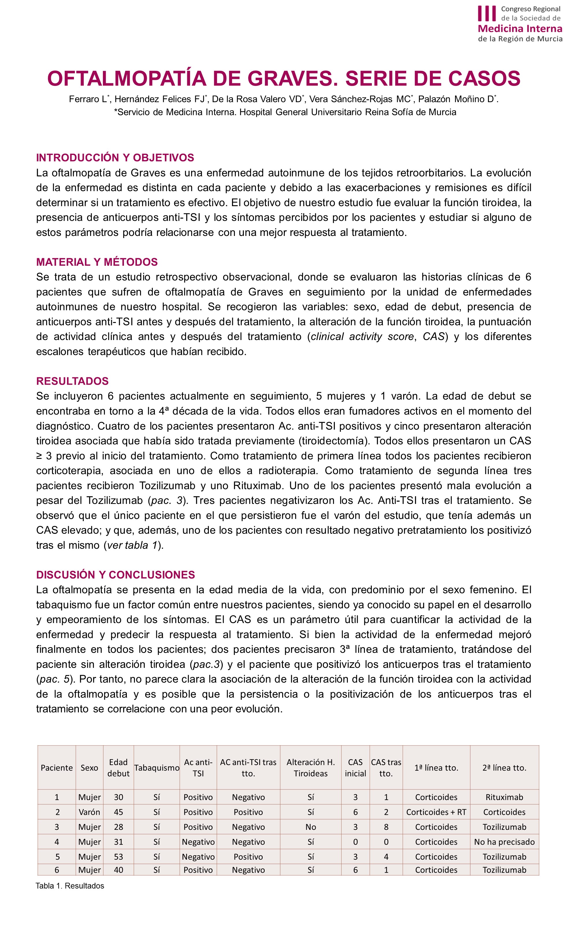 | P83 | Título: Oftalmopatía de Graves. Serie de casos. Autores: L. Ferraro; F.J. Hernández Felices; V.D. de la Rosa Valero; M.C. Vera Sánchez Rojas; D. Palazón Moñino. |