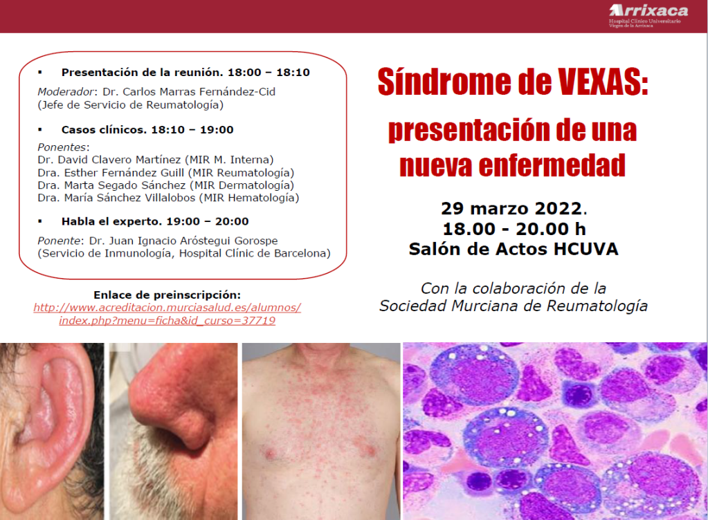 Os animamos a participar en la reunión organizada en el Hospital Clínico Universitario Virgen de la Arrixaca el día 29 de marzo de 2022 de 18:00 a 20:00 horas, con la colaboración de la Sociedad Murciana de Reumatología titulada «Síndrome de VEXAS: presentación de una nueva enfermedad».