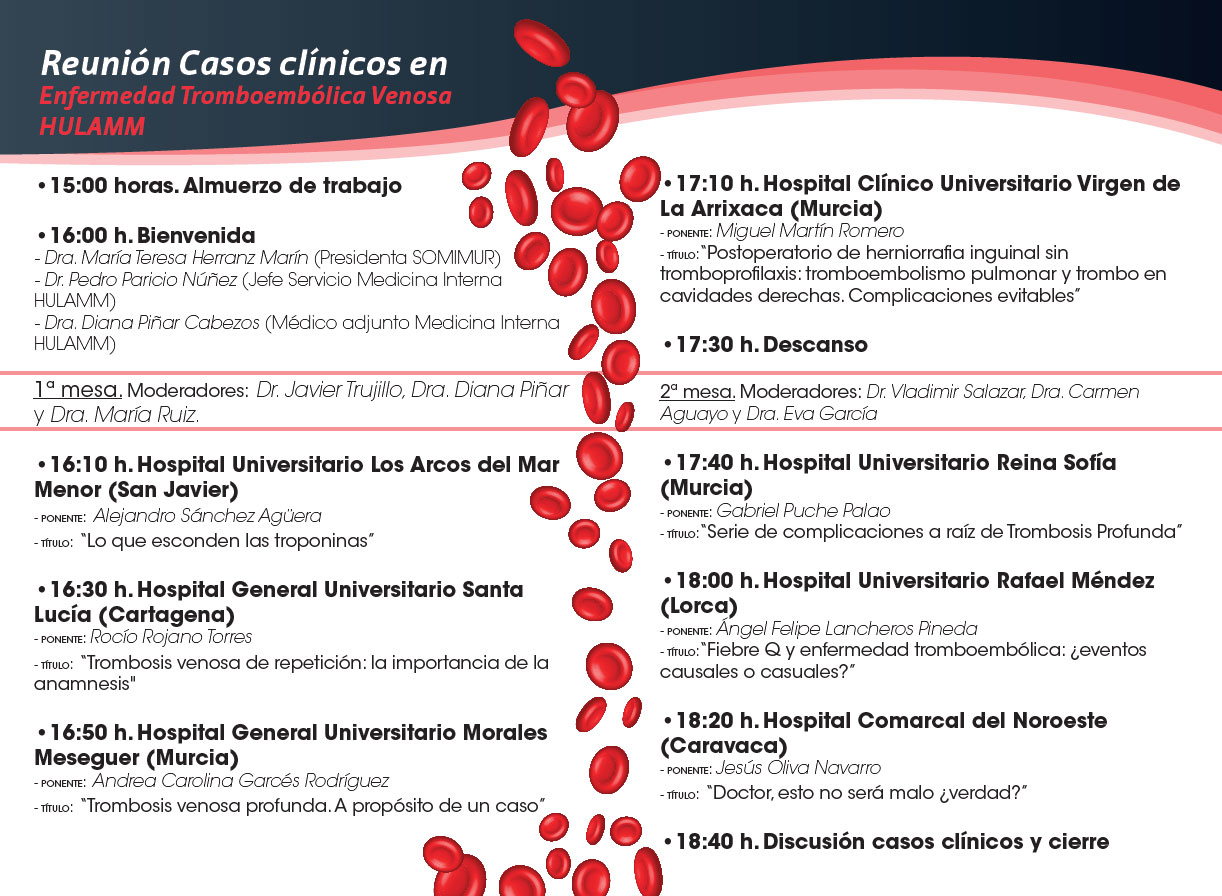 Esta reunión, enfocada a residentes, constará de la presentación de 7 casos clínicos relacionados con enfermedad tromboembólica venosa con la discusión o debate sobre cada uno de ellos.